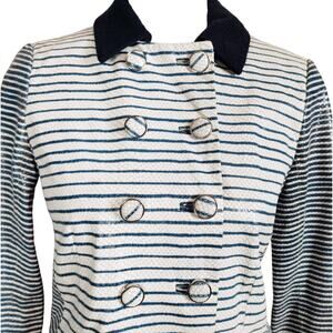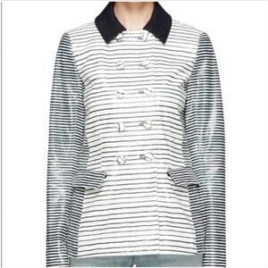 Tory Burch Piper Leather snakeskin effect striped jacket. Double breasted button up. Very cool snakeskin texture but with ivory and green/blue contrasting stripes. Leather on silver buttons. Fully lined. Front flap pockets. Excellent condition. 100% leather.