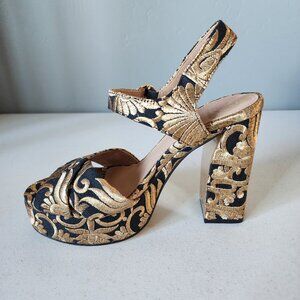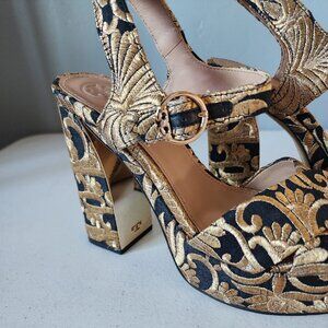 "NEW" Gorgeous Looking Black & Gold Loretta Brocade Platform Sandals By Tory Burch. Textile Covered Leather Upper with Adjustable Logo Buckle, Cushioned Foot Bed & Almond Toe, 1.1/4" Covered Platform & 4.5" Heel with Gold-tone Metal Logo Plate Accent, Leather Soles, New, Never Worn, Only Tried On:) Rt.400.00 approx. Size 7.5, Foot Bed Measures 9.5" for Reference. * Perfect Event, Party, Holiday Shoe!