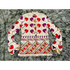TORY BURCH pull-over style "Pokhara" tunic. This is a beautifully embroidered piece in brilliant colors. It has long flared sleeves with a split design at the sides.