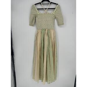 This ankle-length dress is crafted from hand-woven silk dupioni, which is thicker and stronger than traditional silk. A smocked bodice delivers a custom fit, while the softly gathered skirt falls effortlessly — its easy movement enhanced by alternating green-and-white polka dots.