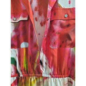 Crafted from pure silk twill with a vibrant watercolor print, this dress features a button-front placket, chest and side pockets, and a flattering elastic waist.