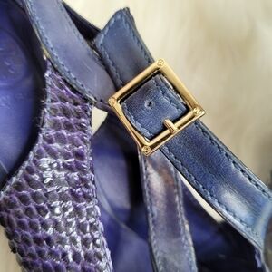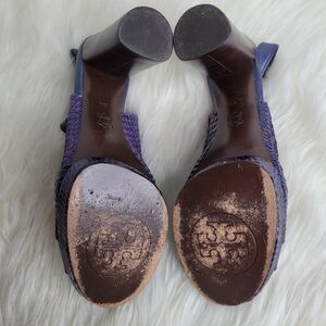 These purple, embossed, chunky heels by Tory Burch are amazing! the platform allows for easy wear and the chunky heel gives a trendy but comfortable style! Heels are in great condition. See all photos, questions please ask.