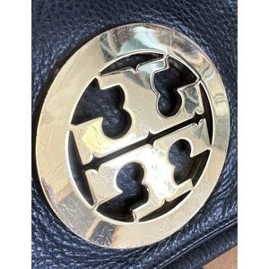 This beautiful Tory Burch handbag is the perfect addition to any outfit. The sleek black exterior is made of high-quality leather and features a her signature gold logo accent. The clutch style bag has a magnetic closure and a removable shoulder strap for versatility.