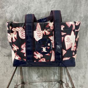 Tory Burch Purse Tote shopper Bag Birds Logo, Canvas & Patten Leather blk/navy shows some fading see last photo for details.