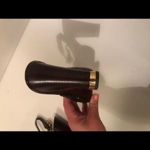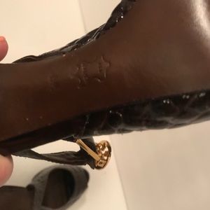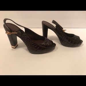 Bought at a sample sale, Tory Burch Brown Python Print style sling back pump. Gently worn, heels or body of shoes have no markings. Wear is only on bottom of shoes. Size of shoes is marked different but fit the same.