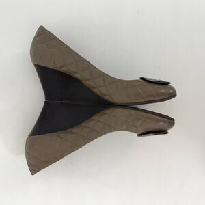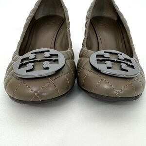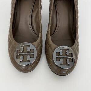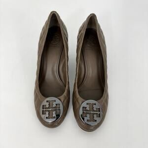 Tory Burch Quinn Quilted Leather Wedge Pumps Shoes Dark Taupe 10M Double T Logo