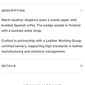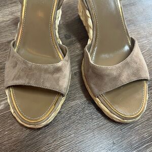 Tan leather suede uppers. Raffia wedges. *Missing ankle strap! Can be replaced with a new strap. Also has a small mark on the side (pictured). Otherwise new and unworn.