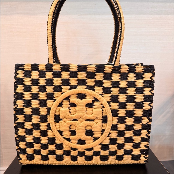 Features: Hand-crochet check pattern with raffia, Tory Burch's Ella signature logo, top handle, open top, and spacious open interior. Trim made of 100% polyurethane.
