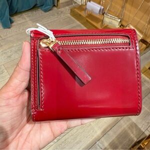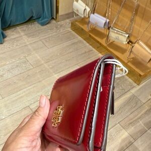Elegant red compact wallet. Features Tory Burch logo. Smooth finish.