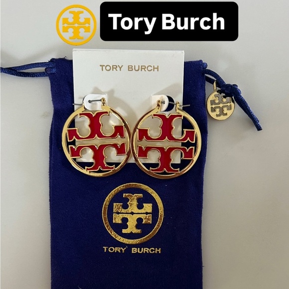 Elegant earrings featuring Tory Burch logo in red and gold. Ideal for elevating any outfit.