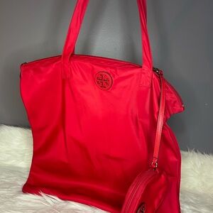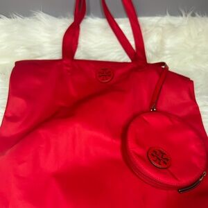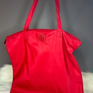 Tory Burch Red Nylon Tote. Made from durable nylon, this tote features the iconic Tory Burch logo and a spacious interior. Perfect for everyday use, it's lightweight and versatile. Upgrade your bag game with this statement piece.