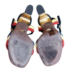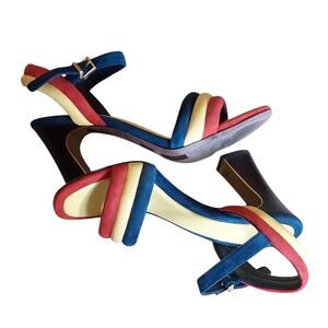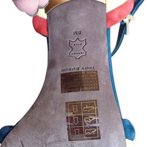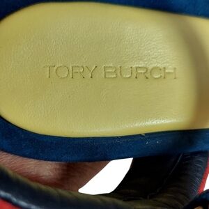 These Tory Burch heels showcase a striking combination of red and blue, perfect for adding a pop of color to any outfit. The chunky heel and ankle strap provide both style and stability, making them ideal for various occasions. Crafted with a smooth finish, these shoes offer a bold yet elegant look.