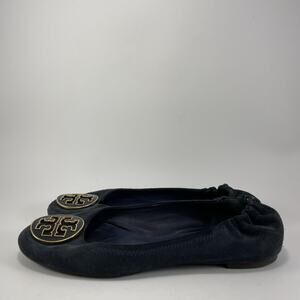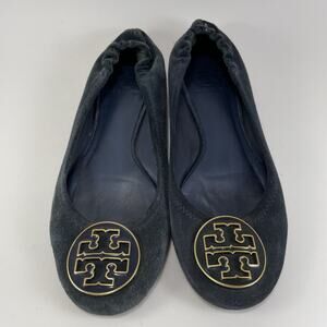 Tory Burch Reva Ballet Flats Shoes Navy Suede Womens Size 7 Slip On Gold Logo