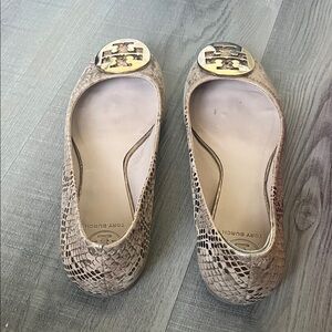 Elegant bronze flats with snakeskin texture. Features signature Tory Burch logo in gold. Perfect for versatile styling.