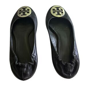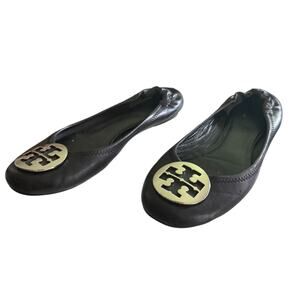 Tory Burch Reva Black Leather Silver Medallion Ballet Flats Size 9.5