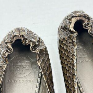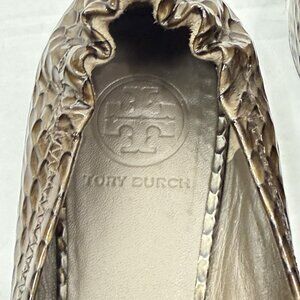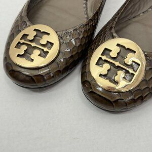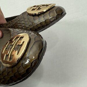 Step into timeless style with these Tory Burch Reva Flats in women’s size 8. Featuring a striking lotus snake print in dark branch tones and finished with the iconic gold Tory Burch metal logo medallion, these shoes blend classic elegance with modern flair.