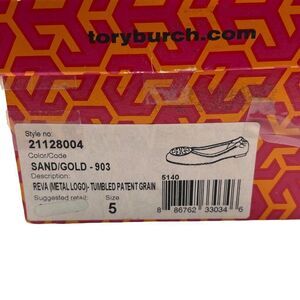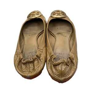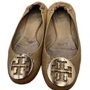 Good condition, Tory Burch. Reva Tumbled Logo Flats. Sand/Gold.These tumbled leather Tory Burch flats in Sand /Gold feature a cutout logo medallion at the vamp and gathered elastic banding at the back. Topstitched top line. Padded footbed and rubber sole. Size 5 Smoke free home. Includes storage bag and box.