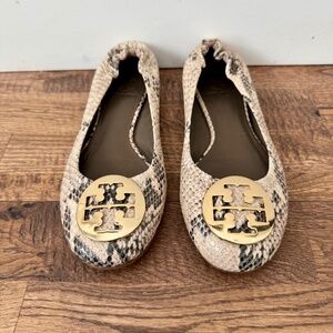 Tory Burch Reva Snakeskin Ballet Flat Shoe Gold Logo Women's Size 6