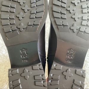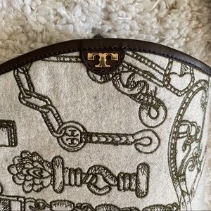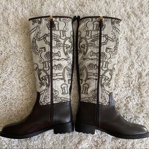 Beautiful Tory Burch riding boots. Upper portion is a fabric stitched Tory Burch pattern. A much more subtle Tory Burch look but beautiful. Only wore once for a photo shoot. Please see blemish in photo.