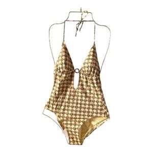 New with tags. Tory Burch one-piece swimsuit in a bold lime-green and tan ‘wicker-style’ all over print. Features a halter neck tie closure, gold-tone ring hardware at the bust, plunge front with moderate rear coverage, low scoop back with tie closure, removable cups, and pull-on style. Size XS (note: swimwear fits smaller than apparel; consider sizing up for more coverage). Lined for comfort. Imported.