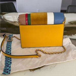 Elevate your style with this chic multicolor Tory Burch shoulder bag. Featuring a blend of blue, white, gold, and tan, this bag is perfect for any occasion. Its elegant design and vibrant colors make it a must-have accessory. Great condition. Small mark on the front suede barely visible and a small amount yellowing on the inside flap.