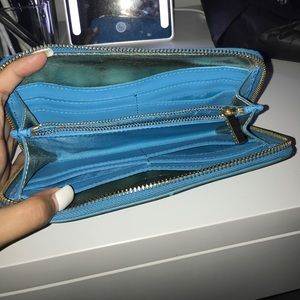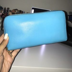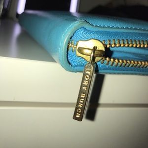 Tory Burch Robinson Continental zip up wallet in electric blue. 7.5"L x 1"H x 4"W