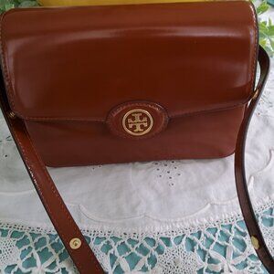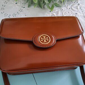 Tory Burch Robinson Convertible Spazzolato Patent Handbag in Dark Sienna