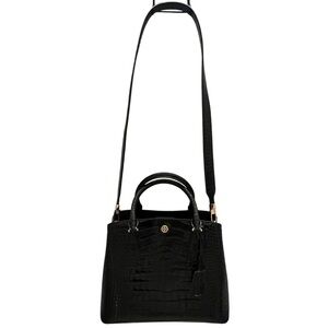 This elegant black bag is from Tory Burch, as indicated by the gold logo emblem on the front. The croc-embossed texture adds a touch of luxury and sophistication, while the structured shape makes it suitable for both professional and polished everyday use. It features top handles and a detachable shoulder strap, giving you styling versatility.
