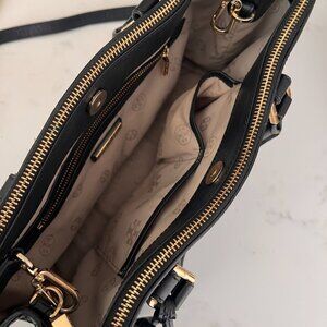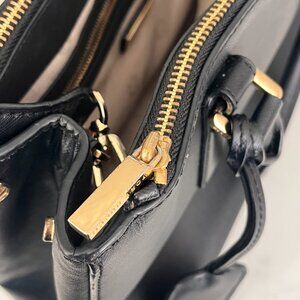 Made of high-quality black saffiano leather and accented with gold hardware, this bag is perfect for any occasion or as a professional work bag. The interior is lined in a lovely satin beige color and features a zippered closure to keep your belongings safe and secure.