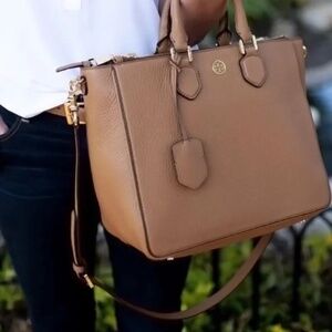 Tory Burch Robinson Multi Tan Pebbled Leather. This bag is made of brown/Tan color pebbled genuine leather.