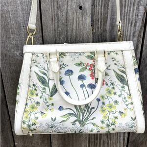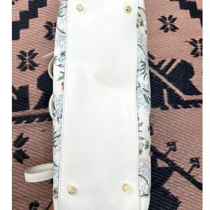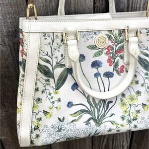 Beautiful Tory Burch botanical print in cream and multicolor floral coated canvas with gold-tone hardware, saffiano leather trim, dual rolled top handles, detachable shoulder strap with buckle adjustment and magnetic snap closure.