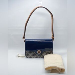 Tory Burch's Robinson shoulder bag is comprised of T Monogram jacquard and shiny patent leather. Goldtone Double T hardware finishes this piece.
