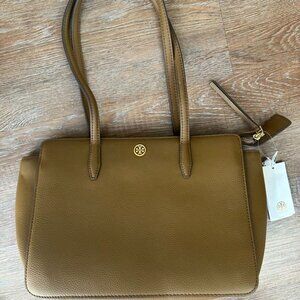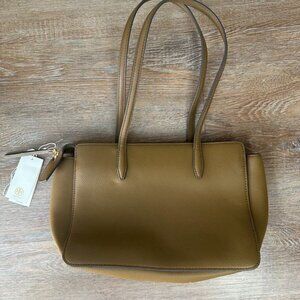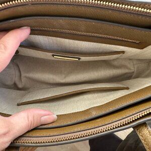 Brand new tags on, pebbled finish, color no longer available in stores (it's a light brown with green undertones). Includes dust bag. Height: 10.6" (26.9cm); length: 14.8" (37.5cm); depth: 5.1" (13cm)