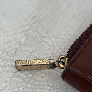 Beautiful deep chocolate leather with gold accents. Zip center pouch for change and 16 card slots. Leather is in good condition, hardware shows some signs of wear seen in photos