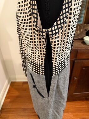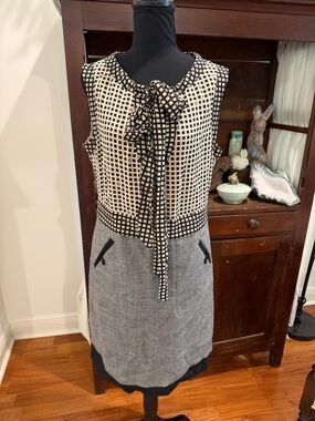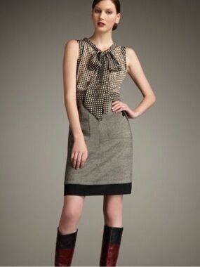 Tailored dress in a textured gray fabric. Clean lines with a contrasting black hem. Sleek, office-ready silhouette. Pairs well with boots.