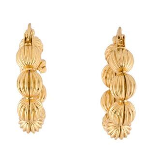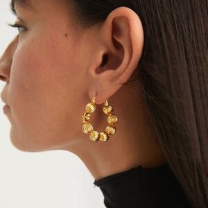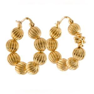 Bold and sculptural, the Roxanne earring features a series of fluted beads. In lightweight brass, 18k gold plated with a carved Double T, it has the look of vintage jewelry.