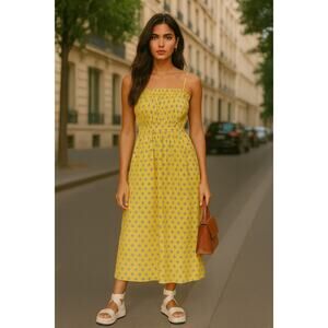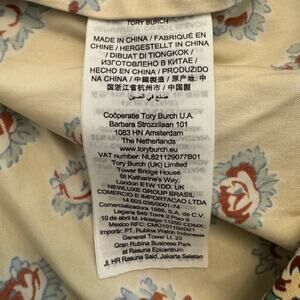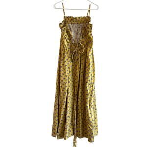 Tory Burch Ruffle Top Dress in Yellow. Size 12. Features square neckline, ruffle trim on neckline, open back with tie closure, adjustable spaghetti straps, side seam pockets, straight hem, all over floral design, midi length. 69% cotton, 27% nylon. Excellent condition, no flaws.