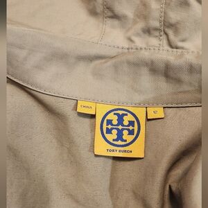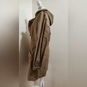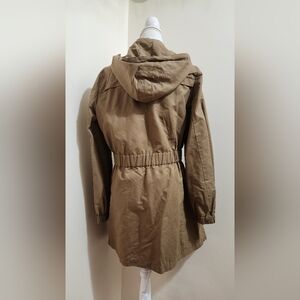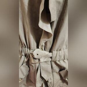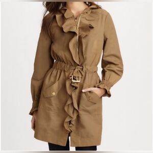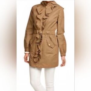Stylish brown utility jacket with ruffle detailing. Features front pockets and a belted waist. Two way zipper to unzip from the bottom & the top. Hooded with logo badging on buttons. Ideal for versatile wear. Lightweight for spring & fall or layered for cooler days.