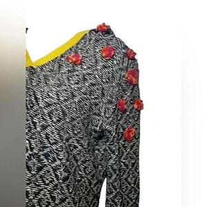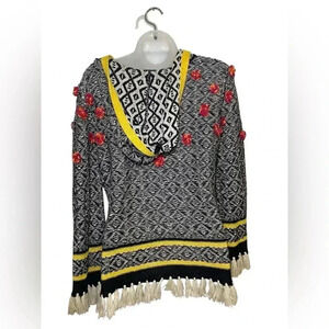 Rare and stunning Tory Burch Runway sweater, size XS. This limited edition piece is crafted from 100% linen and features intricate design elements including a black and white geometric knit pattern, vivid red-orange floral rosettes on the shoulders and sleeves, and bold yellow trim at the neckline and hem. Hooded with a contrast print interior and finished with fringe along the sleeves and bottom hem. A true statement piece for any collector or fashion enthusiast.