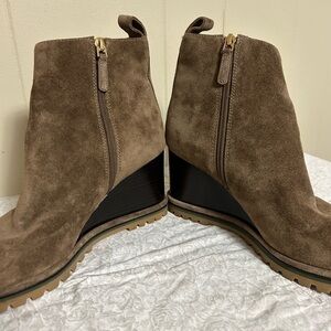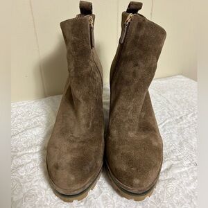 Tory Burch SUEDE LOGO LUG SOLE WEDGE BOOT Size 9 river rock tan Chunky Preppy
