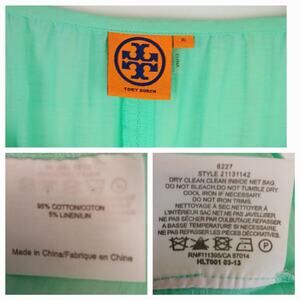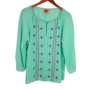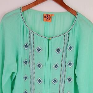 Tory Burch SZ 10 Lucille Seafoam Green Beaded Split Neck Blouse Cotton Linen