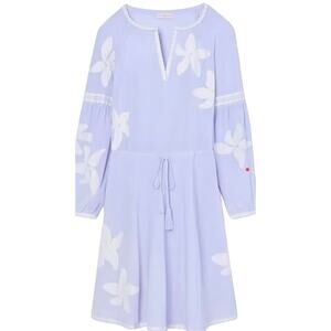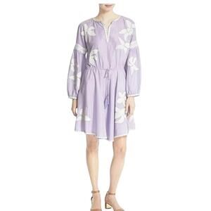Floral appliqués and embroidered accents create rich dimension on a flowing split-neck dress colored in a serene lavender tone and framed with long blouson sleeves. Slips on over head. Split neck. Long sleeves with single-button cuffs. Drawstring waist. Partially lined. 100% polyester. 40" length. By Tory Burch;ountry of Origin - Textiles.