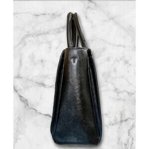 Exterior – Saffiano leather, structured body, front and back full section/pockets with magnetic interior closure, middle zippered closure, gold hardware, adjustable/removable crossbody strap, round handles and gold T emblem.