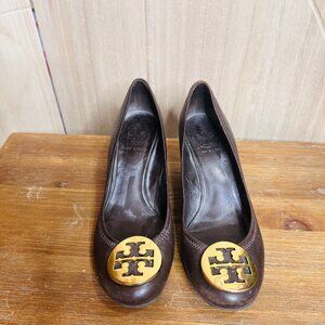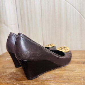 Tory Burch Sally Chocolate Dark Brown Leather Wedges Metallic Gold Logo 6.5
