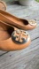 Tan leather wedge with gold logo medallion at vamp. Size 9.