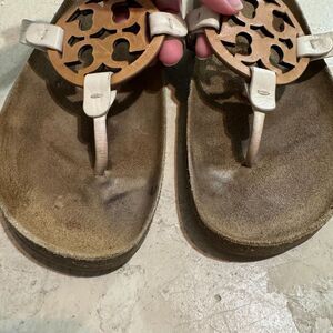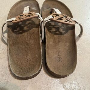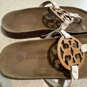 Tory Burch Sandals Cloud Miller Thong Cork Leather Tan Cream Slip On Womens sz 9