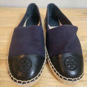Tory Burch Shoes Womens Size 8 Navy Black Espadrille Flats Leather Cap Toe Logo