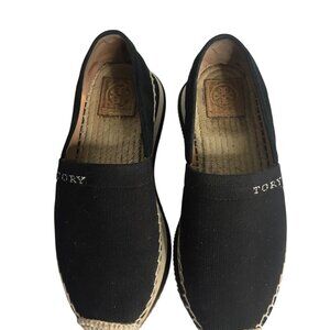 Tory Burch Shoes Womens Size 8.5 Black Espadrille Slip-On Canvas Jute Logo Flat