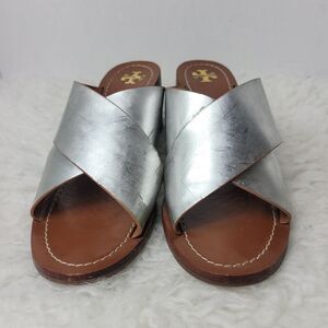 Tory Burch Shoes Womens Size 9 M Montrose Mirror Slip On Silver Leather Heel