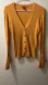 This Tory Burch Shrunken Simone Cardigan Sweater is made of 100% cotton and has a slim silhouette. It has a ribbed design throughout with a deep v neckline and folded attached wrist cuffs. It also has gold logo buttons and comes in a warm marigold/mustard yellow color. This casual cardigan is in overall good used condition and a women’s size small (S).